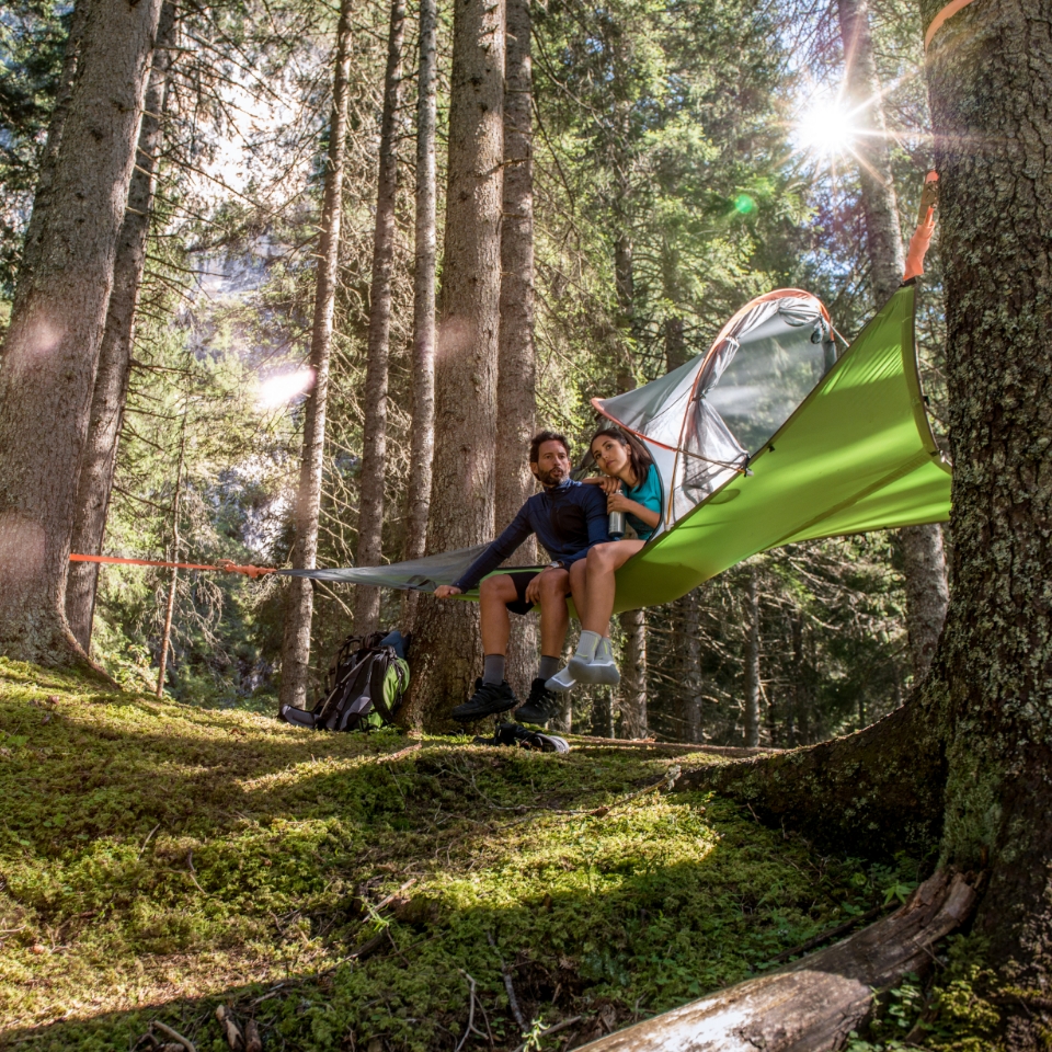 Passez une nuit au cœur de la forêt de Fontestorbes en Ariège. Nos deux tentes suspendues vous offrent une expérience de bivouac perchée entre les arbres à deux mètres du sol. Vous pourrez vous endormir après avoir observé les étoiles, et vous réveiller au chant des oiseaux.